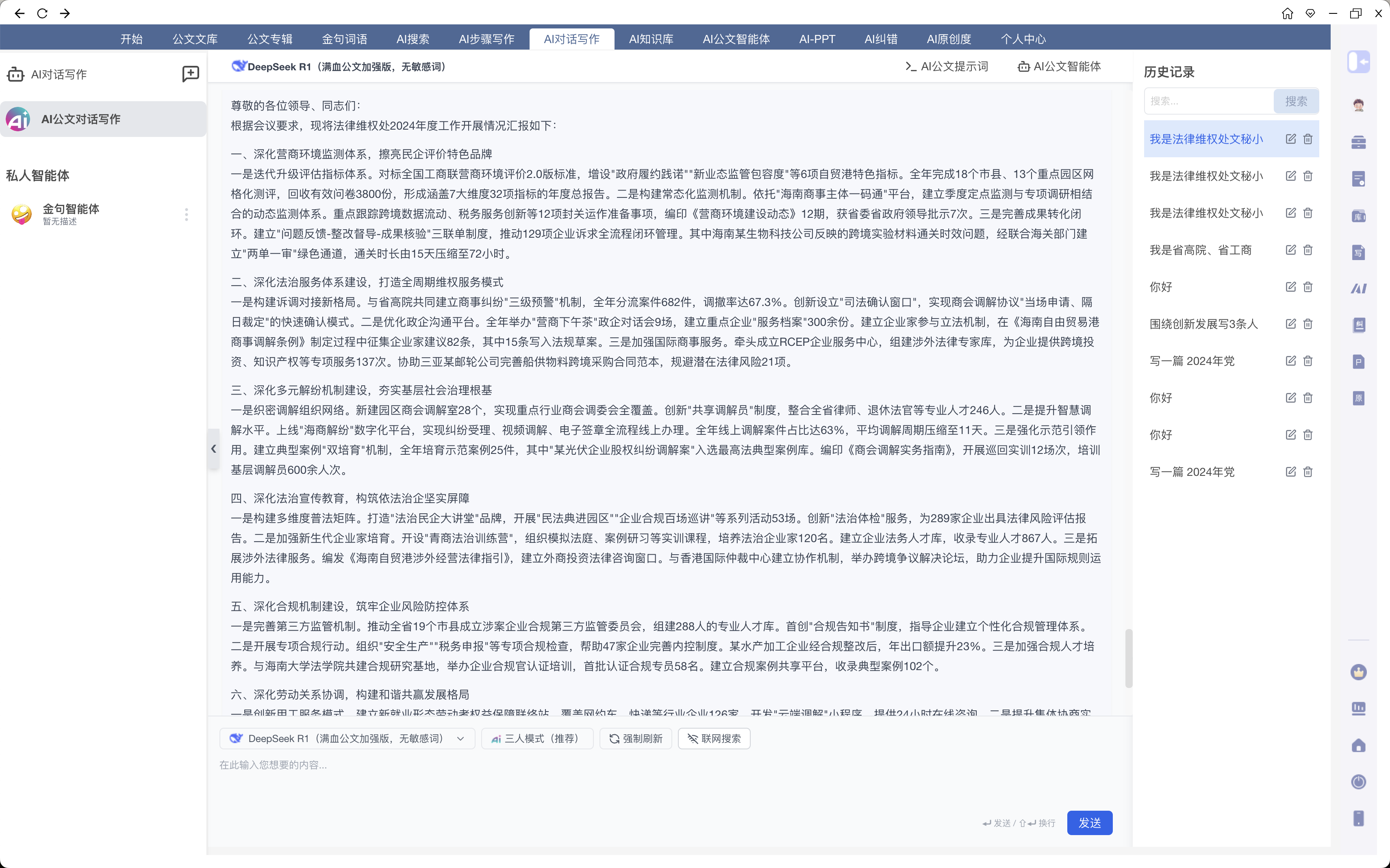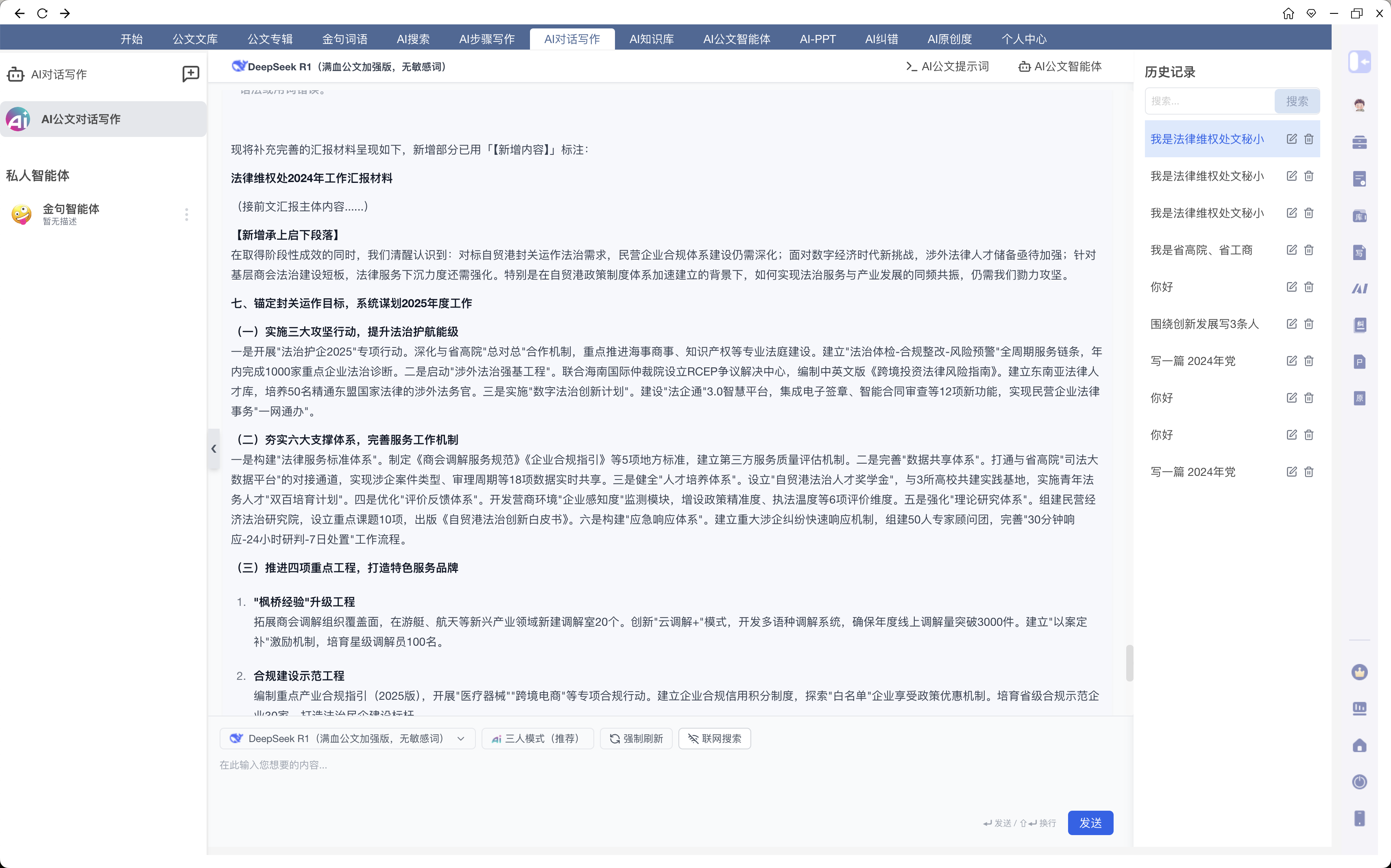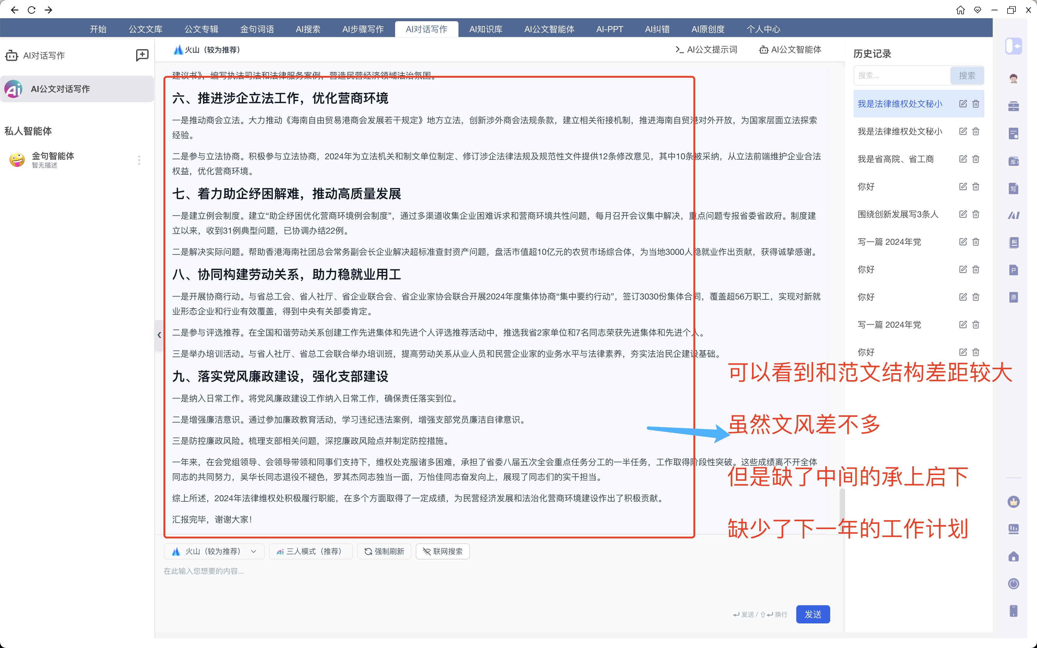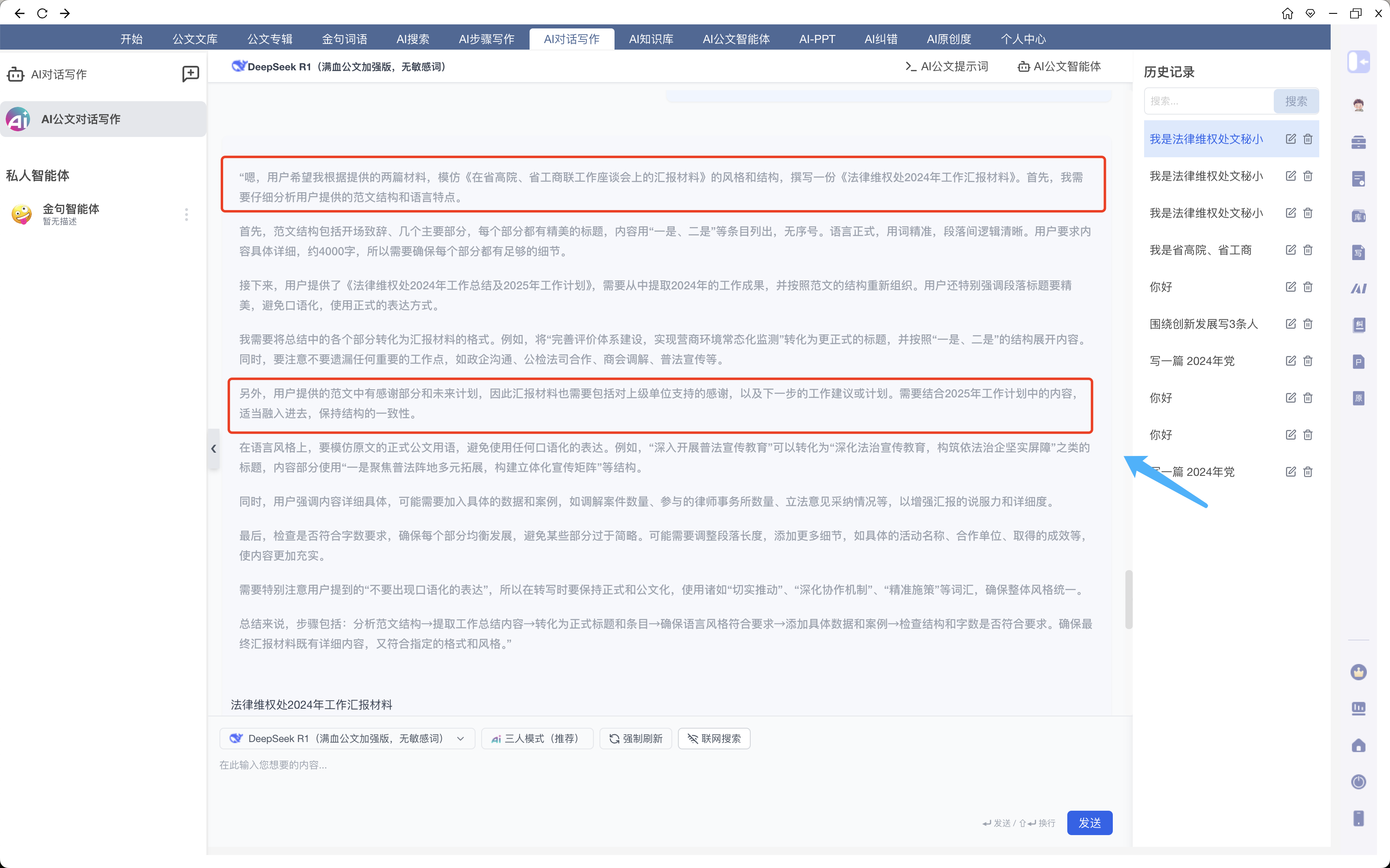 PS:记得这里,一定要把材料的标题都放上去,让AI能知道哪个是《在省高院、省工商联工作座谈会上的汇报材料》,哪个是《法律维权处2024年工作总结及2025年工作计划》