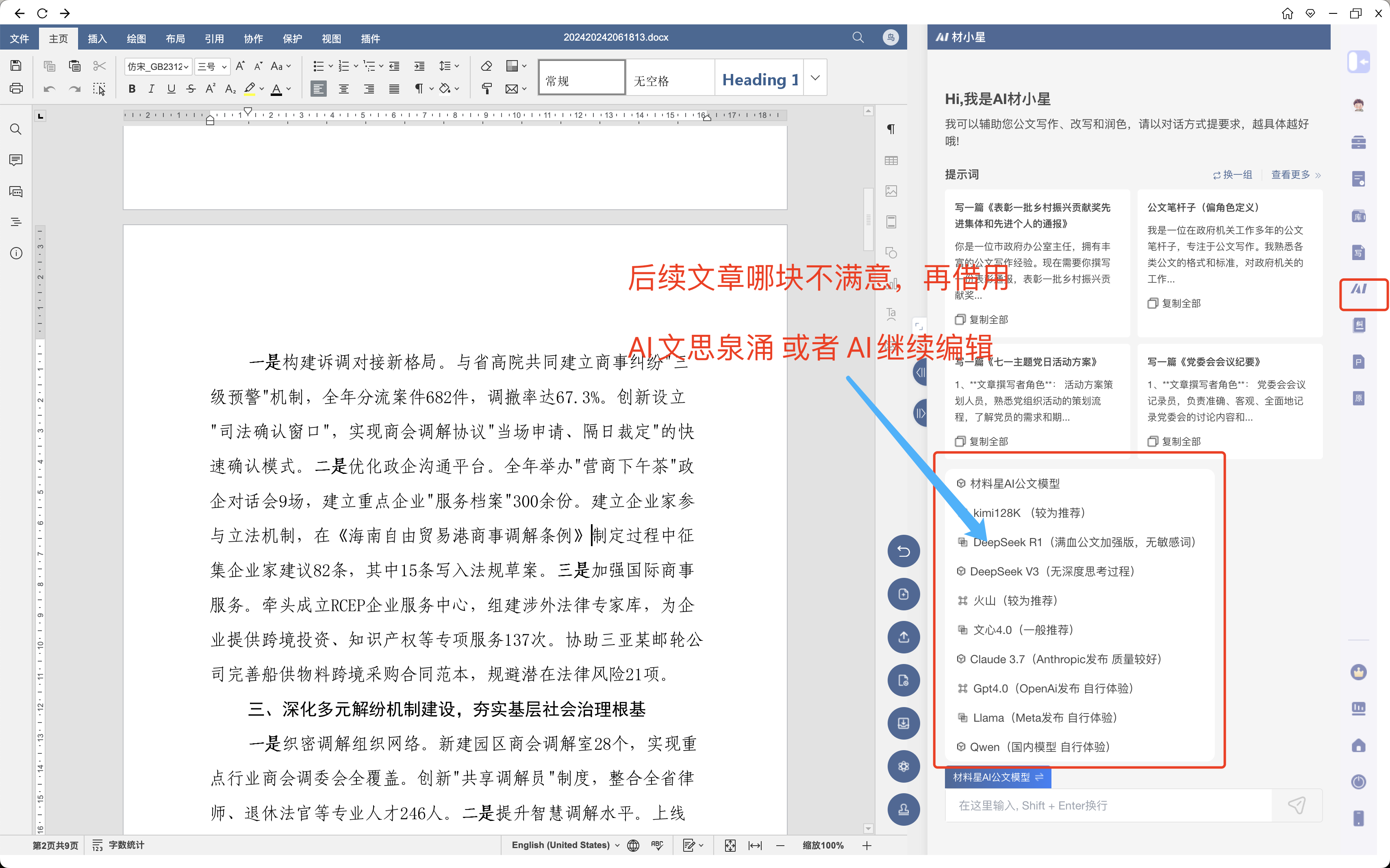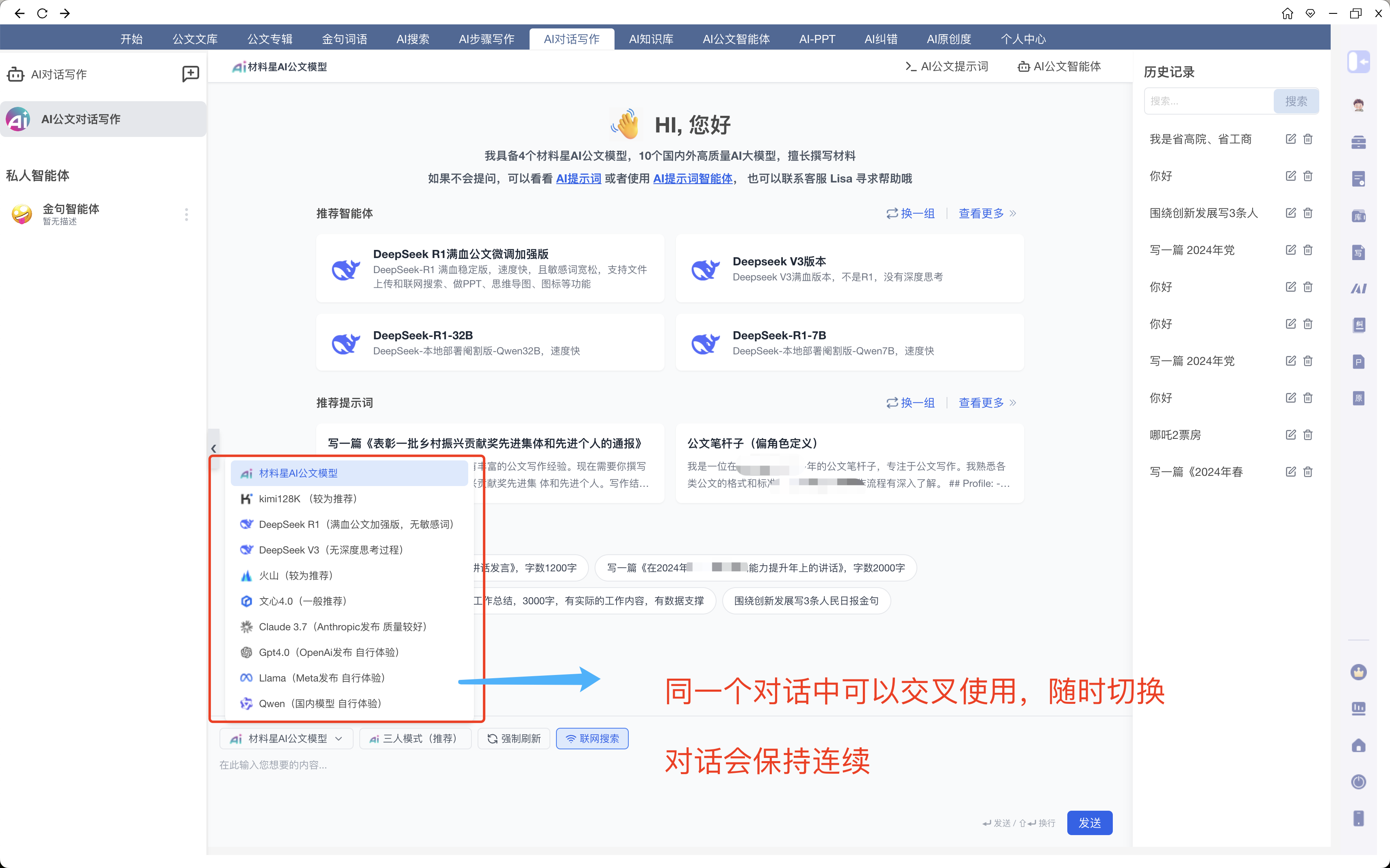 AI对话写作有10个模型,每个模型之间可以交叉使用,也就是说第一轮对话,可以用ds,下一轮,可以用豆包,也可以用 Ai材料星公文模型