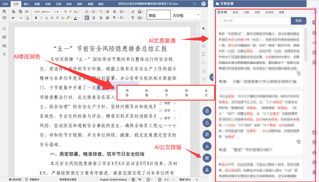 如不满意可使用其中的AI文思泉涌、Ai修改润色功能