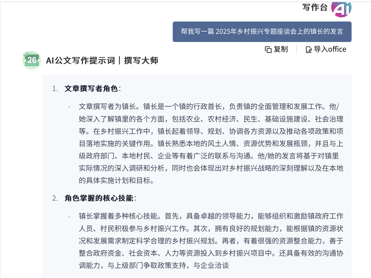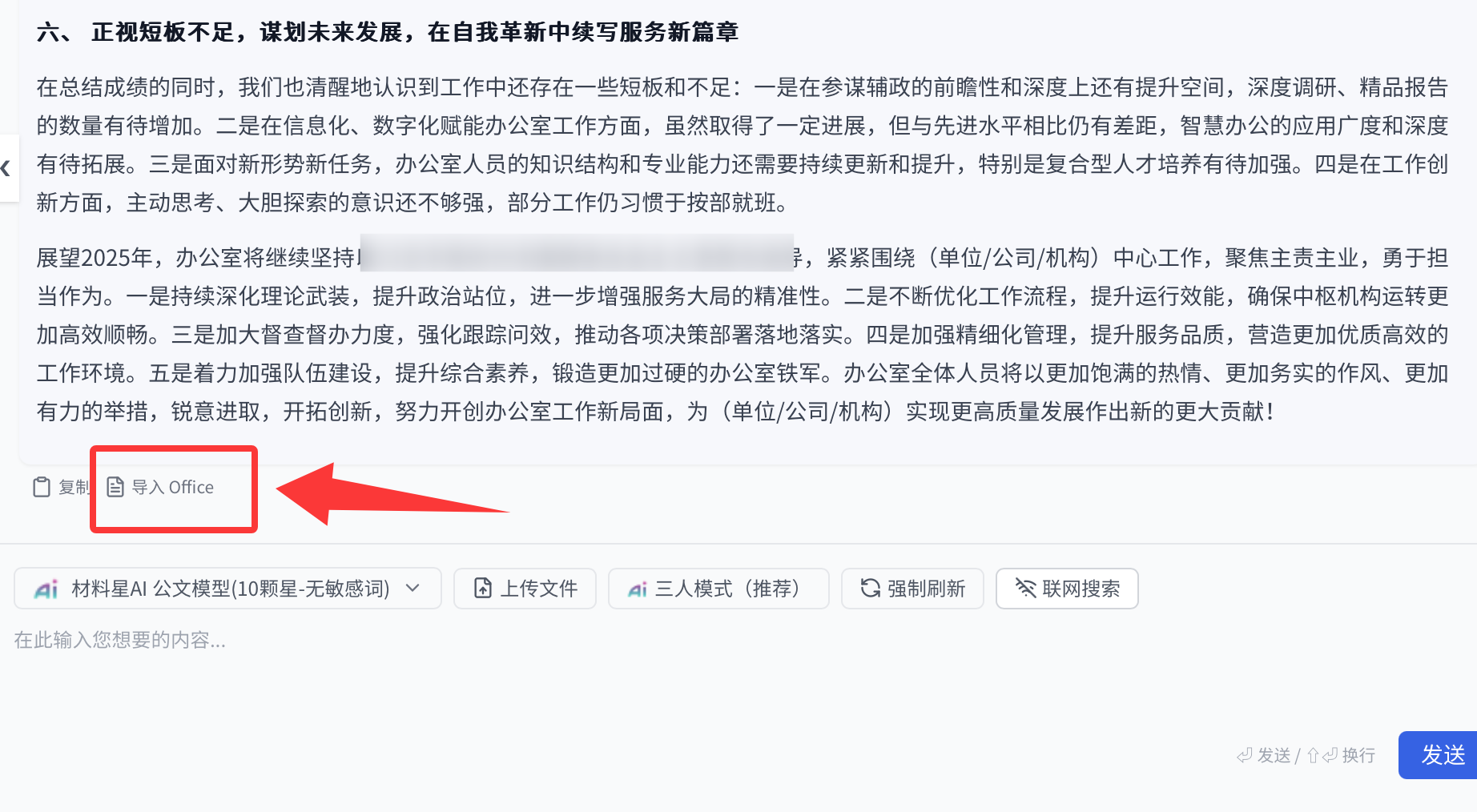 2、AI 撰写完成后,您可直接点击【导入 office】进行在线编辑,根据实际需求对内容进行进一步修改和完善。