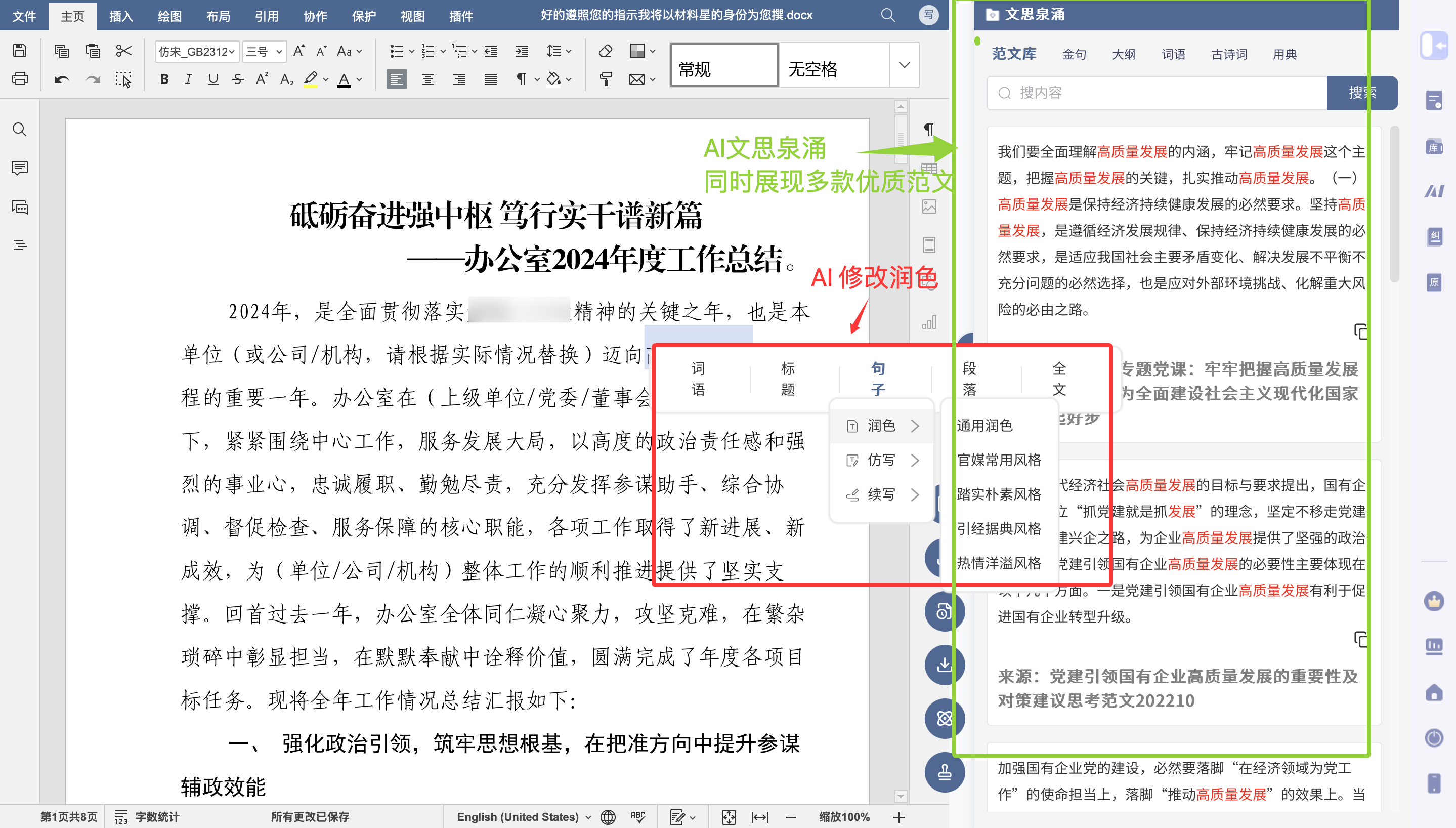3、Office一键公文排版中可使用AI文思泉涌、Ai修改润色功能