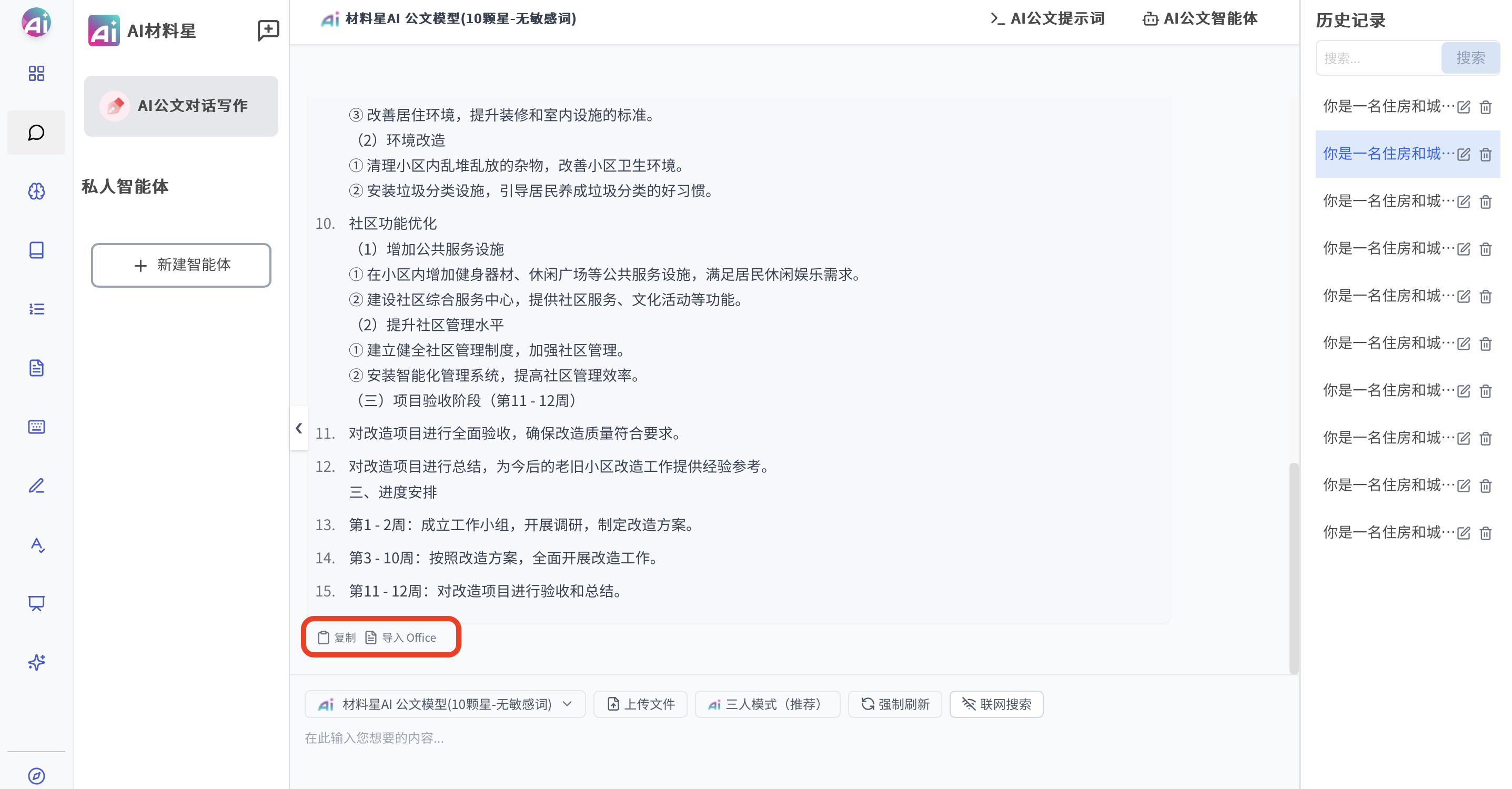 3)生成公文文本,如不满意可继续使用对话功能优化修改。内容合适后使用文末复制或导入 Office功能轻松利用素材。