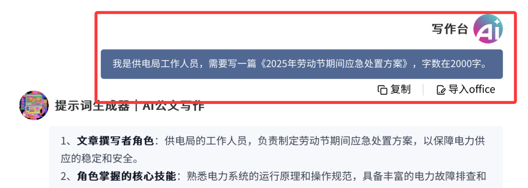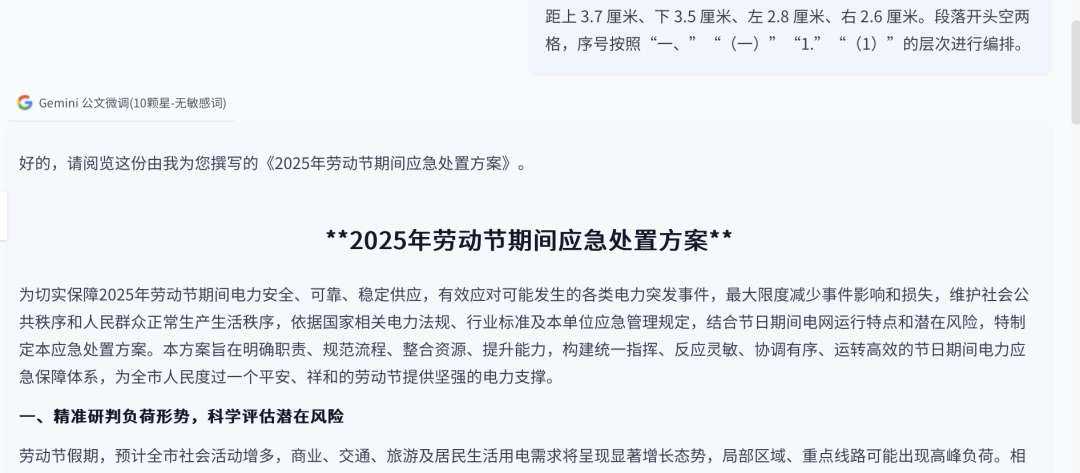 如:我是供电局工作人员,需要写一篇《2025年劳动节期间应急处置方案》,字数在2000字。